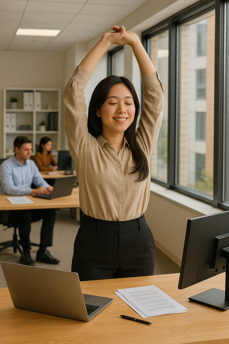 실천 방법은 어렵지 않습니다. 의자에서 일어나 두 손을 깍지 끼고 위로 쭉 올려 몸통을 좌우로 천천히 기울이는 동작, 허리를 곧게 펴고 어깨를 크게 뒤로 돌리는 동작, 복도나 사무실을 1분 정도 빠르게 걷는 것만으로도 척추 주변 근육의 긴장이 완화되고 혈액순환이 좋아집니다. 서서 허벅지 앞쪽과 종아리 근육을 늘려 주면 오래 앉아 있을 때 뻐근해지는 무릎과 발목에도 도움이 됩니다.