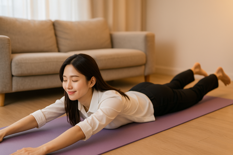 실천 방법은 어렵지 않습니다. 바닥에 매트나 요를 깔고, 배가 편안하게 닿도록 엎드립니다. 이때 허리가 꺾이지 않도록 배 아래에 얇은 쿠션을 받쳐도 좋습니다. 양팔은 머리 위로 뻗어 손끝과 팔이 Y자 형태가 되게 하고, 어깨를 귀에서 멀리 끌어내린다는 느낌으로 날개뼈를 살짝 모읍니다. 고개를 과하게 들지 말고 턱을 가볍게 당긴 상태로 5초 유지, 5초 휴식을 10번 반복해 줍니다. 처음에는 하루 5분, 익숙해지면 10분 정도까지 늘리면 충분합니다.