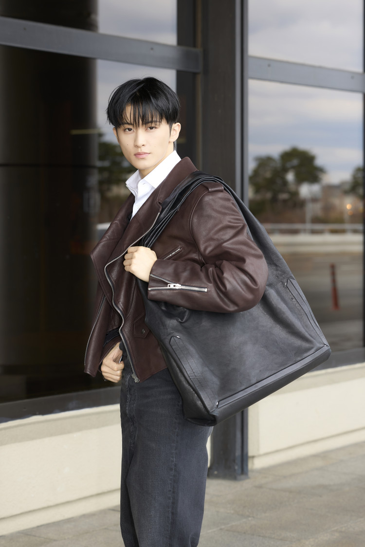 NCT 마크는 폴디드 레더 브라운 컬러 바이커 재킷과 코튼 셔츠를 함께 착용하고, 로우 라이즈 실루엣이 돋보이는 데님 팬츠를 매치해 쿨한 무드의 공항패션을 선보였다. 여기에 타비 앵클부츠와 글렌 마틴스가 SS26 컬렉션에서 새롭게 선보인 블랙 컬러 미디엄 박스 백을 더해 트렌디한 출국 룩을 연출했다.