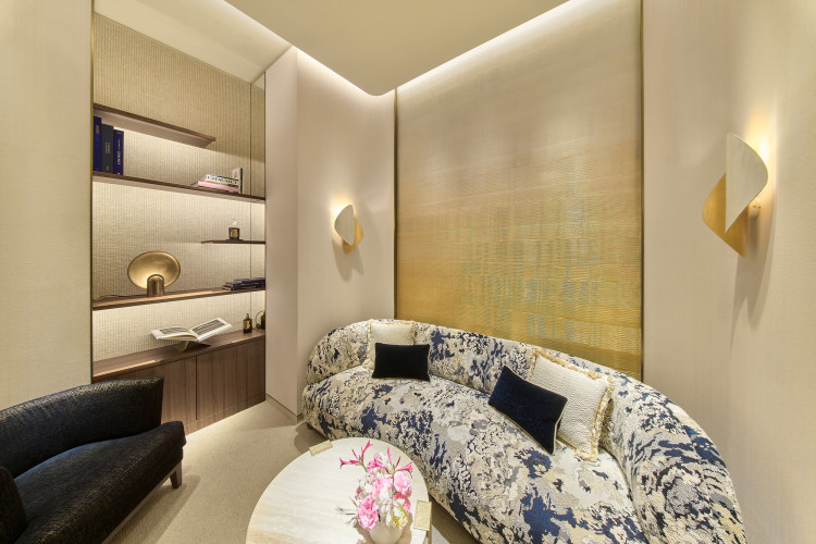 이어지는 공간에서는 아틀리에 드 라 토르(Atelier De La Torre)가 완성한 유리 프레스코가 쇼메 블루를 골드 빛으로 전환시키며, 방돔 광장 12번지 ‘진주 살롱’에 대한 오마주를 섬세하게 풀어낸다.